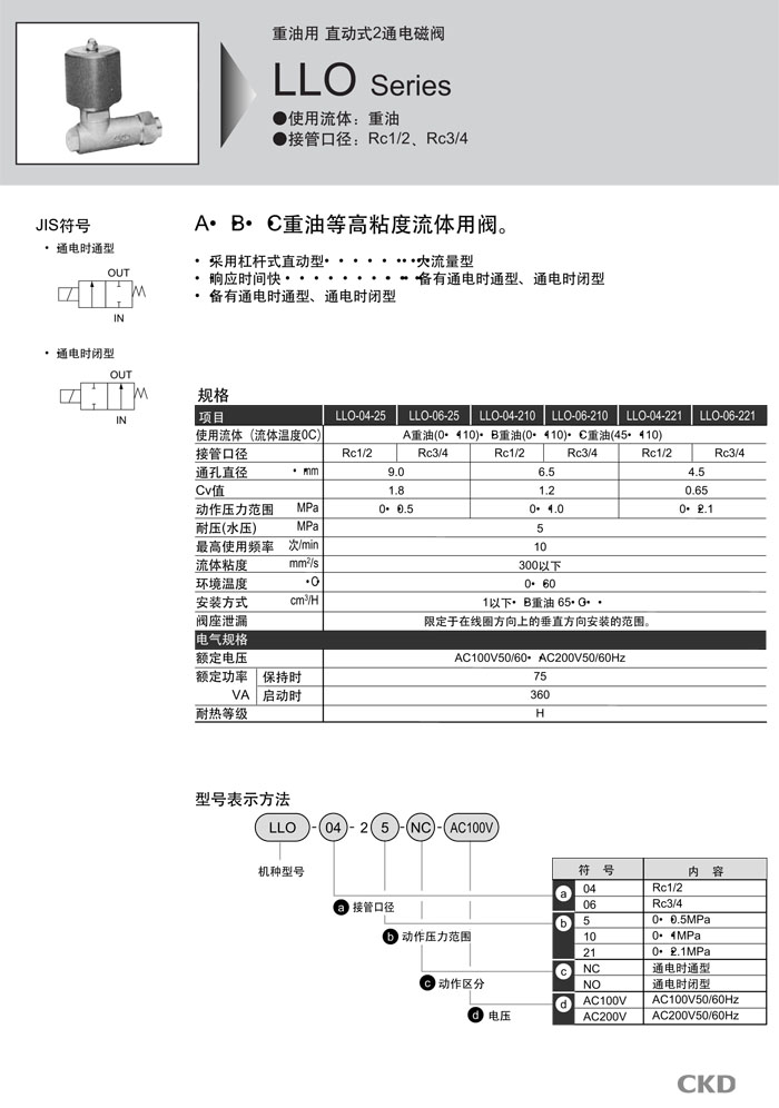 LLO-04-25,LLO-06-25,LLO-04-210,LLO-06-210,LLO-04-221,LLO-06-221,CKD直動(dòng)式2通電磁閥