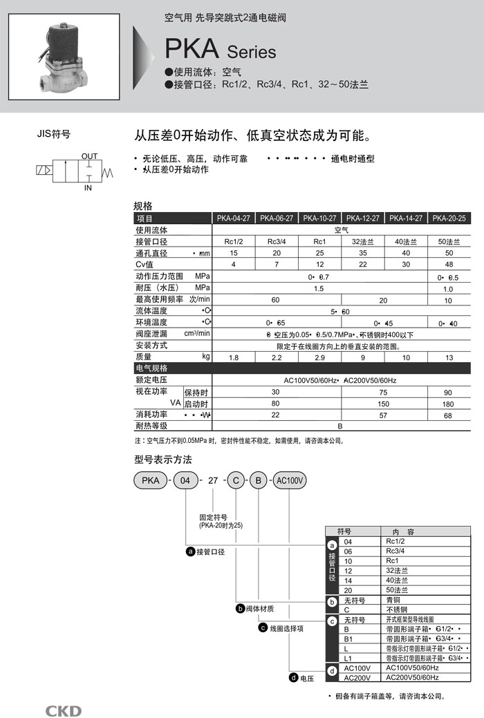 PKA-04-27,PKA-06-27,PKA-10-27,PKA-12-27,PKA-14-27,PKA-20-27,CKD先導式2通電磁閥