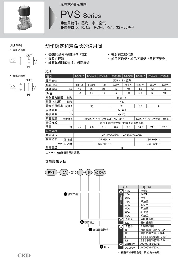 詳細信息 PVS-15A-210,PVS-20A-210,PVS-25A-210,PVS-32A-210,PVS-40A-210,PVS-50A-210,PVS-65A-210,PVS-80A-210,CKD先導式2通電磁閥