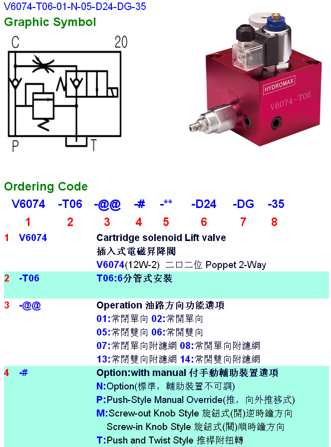 型號: V6074-T06-02,V6074-T06-05,V6074-T06-06,V6074-T06-07,V6074-T06-01-N-05-D24-DG-35,HYDROMAX插入式電磁升降閥