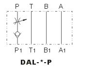 DAL型疊加式節(jié)流單向閥,它是單向閥和節(jié)流閥串聯(lián)組合的一種節(jié)流單向閥,它的作用是只允許油液單方向通過并用節(jié)流閥進行流量調(diào)節(jié),而反向則截止。