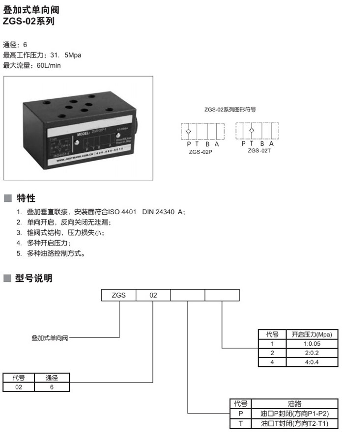 型號(hào): ZGS-02P1,ZGS-02P2,ZGS-02P4,ZGS-02T1,ZGS-02T2,ZGS-02T4,疊加式單向閥