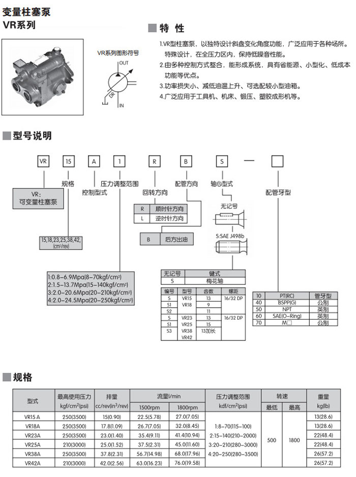 VR15A,VR18A,VR23A,VR25A,VR38A,VR42A,VR23A1RBS1,VR42A4RLS3,變量柱塞泵
