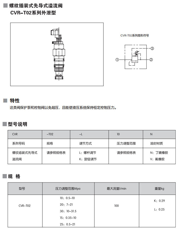 CVR-T02-L10N,CVR-T02-K10N,CVR-T02-L20N,CVR-T02-L30N,CVR-T02-L1SN,CVR-T02-L2SN,螺紋插裝式先導(dǎo)式溢流閥