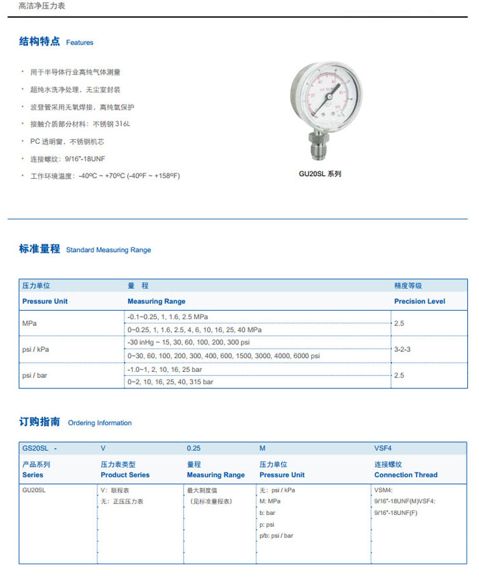 GU20SL-V2.5M,GU20SL-2.5M,高潔凈壓力表