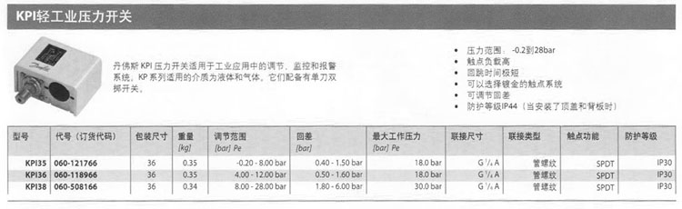 詳細(xì)信息 KPI35,KPI36,KPI38,輕工業(yè)壓力開(kāi)關(guān)