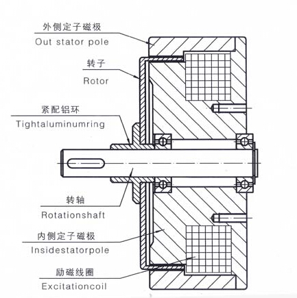 磁滯制動(dòng)器由轉(zhuǎn)子和定子磁極兩大部分組成,轉(zhuǎn)子由特殊的磁滯材質(zhì)制成,內(nèi)、外側(cè)定子磁極之間有一定的間隙,轉(zhuǎn)子在間隙中轉(zhuǎn)動(dòng)。當(dāng)線圈通電時(shí),間隙中產(chǎn)生磁場(chǎng),是轉(zhuǎn)子產(chǎn)生磁滯效應(yīng)。當(dāng)磁滯轉(zhuǎn)子在外力作用下克服磁滯力轉(zhuǎn)動(dòng)時(shí),也可通過(guò)減速機(jī)測(cè)試產(chǎn)生額定的扭矩。扭矩僅與激磁電流大小有關(guān),與轉(zhuǎn)速無(wú)關(guān),實(shí)現(xiàn)非接觸的扭矩傳輸。