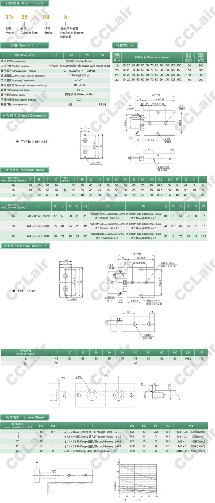 TN16,TN20,TN25,TN32,TN32×150,TN20×40,TN16×70,TN25×100,雙軸氣缸