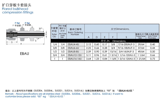 EBAU4-4U,EBAU6-6U,EBAU8-8U,EBAU12-12U,EBAU16-16U,直通擴(kuò)口穿板卡套接頭