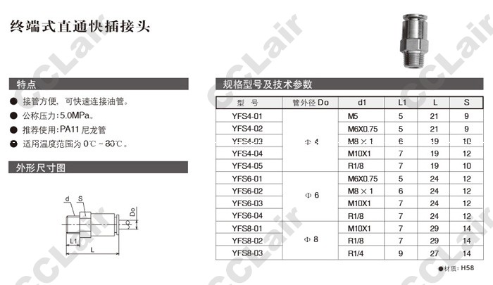 YFS4,YFS6,YFS8,YFS8-01,YFS8-02,YFS4-03,YFS4-04,YFS6-01,YFS6-02,終端式直通快插接頭