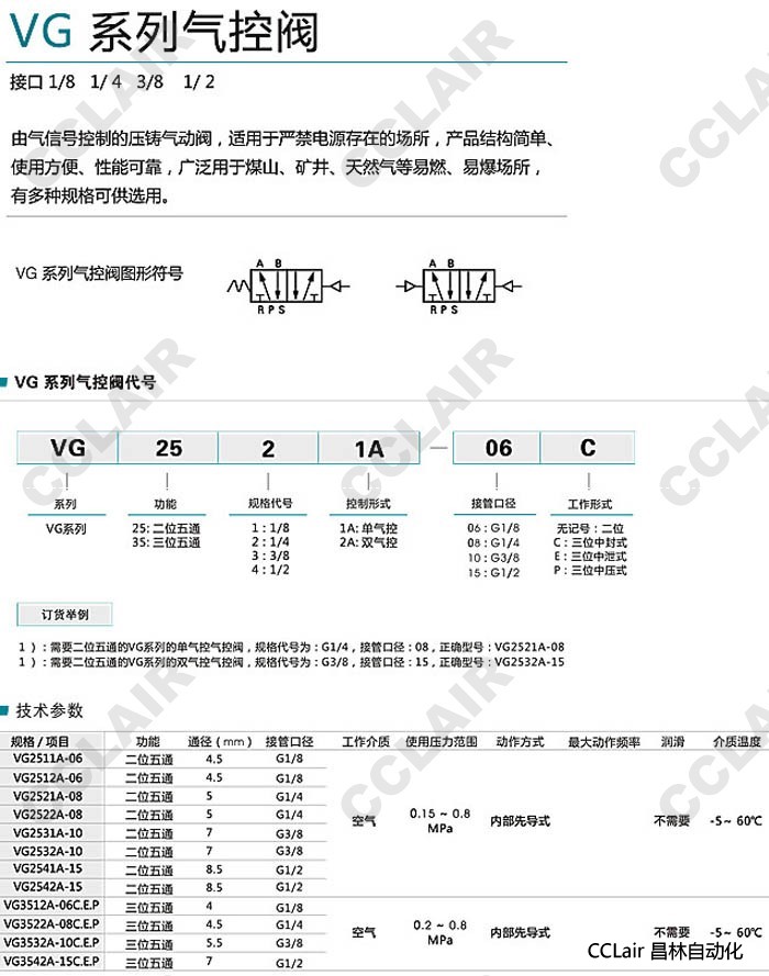 VG2521A-06,VG2511A-08,VG2511A-10,VG2521A-10,VG2542A-15,VG2511A-15,氣控閥