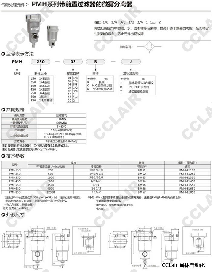 PMH150,PMH250,PMH350,PMH450,PMH550,PMH650,PMH850,帶前置過濾器的微霧分離器