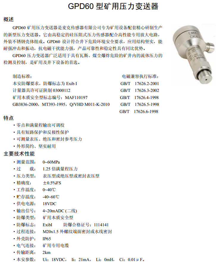 詳細(xì)信息 GPD60E-22,礦用壓力變送器