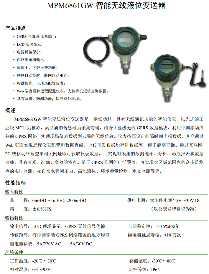 您當(dāng)前的位置:首頁 » 產(chǎn)品&解決方案 » MPM6861GW,智能無線液位變送器