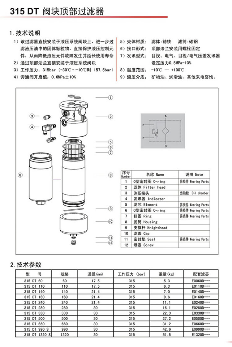 315DT60,315DT110,315DT140,315DT160,315DT240,315DT280,315DT330,315DT500,315DT660,315DT990S,315DT1320S,閥塊頂部過濾器