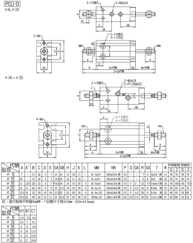 型號: PCU-6,PCU-10,PCU-D-16,PCU-D-20,PCU-25,PCU-D-32,panix多固型氣缸