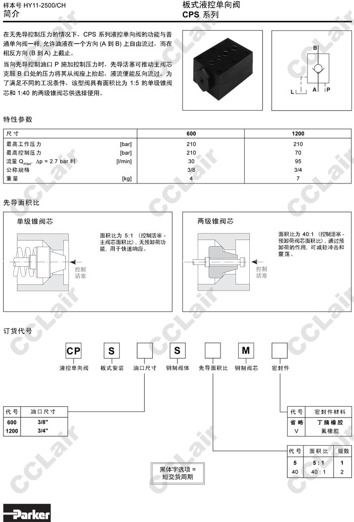 CPS600S5M,CPS600S5V,CPS600S40M,CPS600S40V,CPS1200S5M,CPS1200S5V,CPS1200S40M,CPS1200S40V,Parker板式液控單向