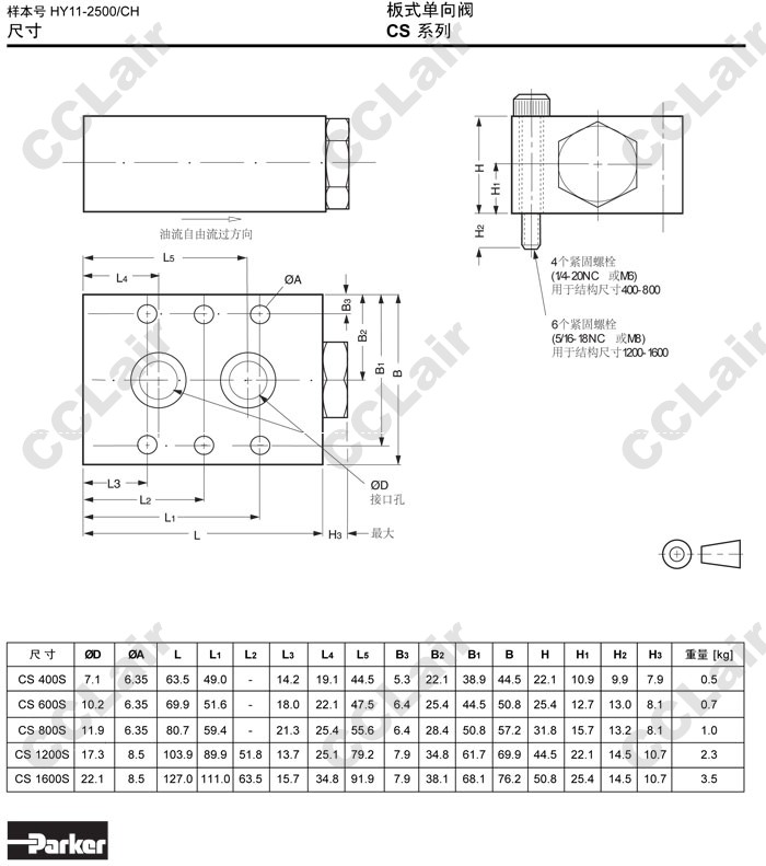 詳細(xì)信息 CS400S,CS600S,CS800S,CS1200S,CS1600S,CS400SV,CS400S65,CS400S65V,Parker板式單向閥