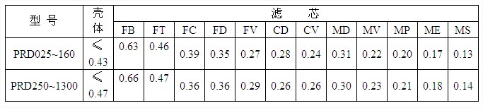 4 額定流量下的清潔濾芯壓降(單位:1×10 5Pa 介質(zhì)參數(shù):30mm 2/s 0.86kg/dm 3)