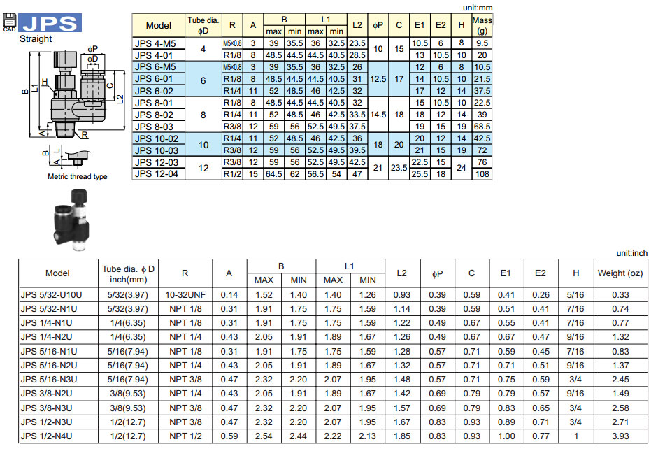 JPS4-01,JPS6-01,JPS6-02,JPS8-02,JPS8-03,JPS10-03,JPS12-04,JPS5/32-U10U,JPS1/4-N2U,JPS5/16-N2U,JPS3/8-N3U,JPS1/2-N3U,JPS1/2-N4U,