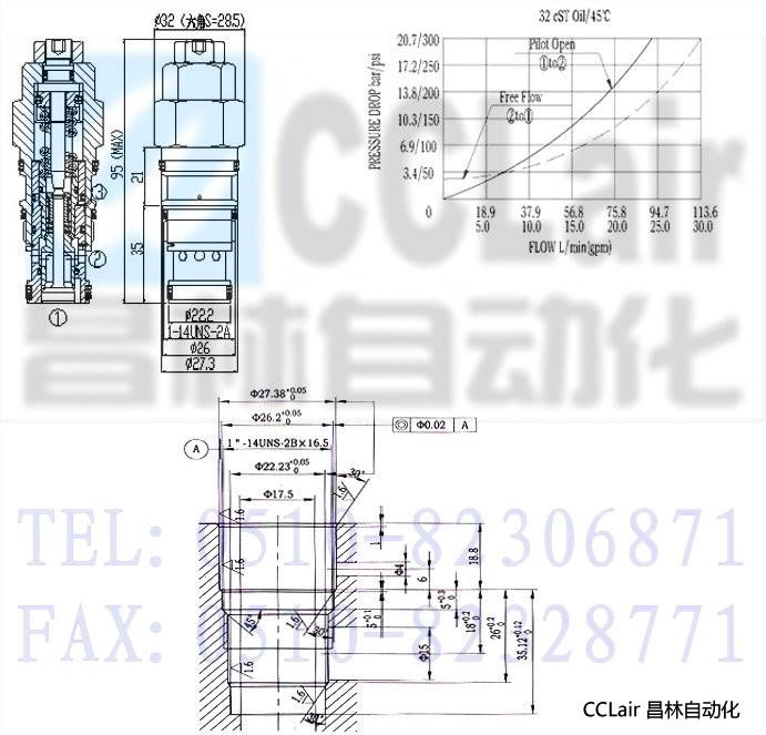 此閥允許液流從②到①自由流動(dòng),同時(shí)阻止其反向流動(dòng),若先導(dǎo) 口③壓力按比例增加,則①到②流量也按比例增加。