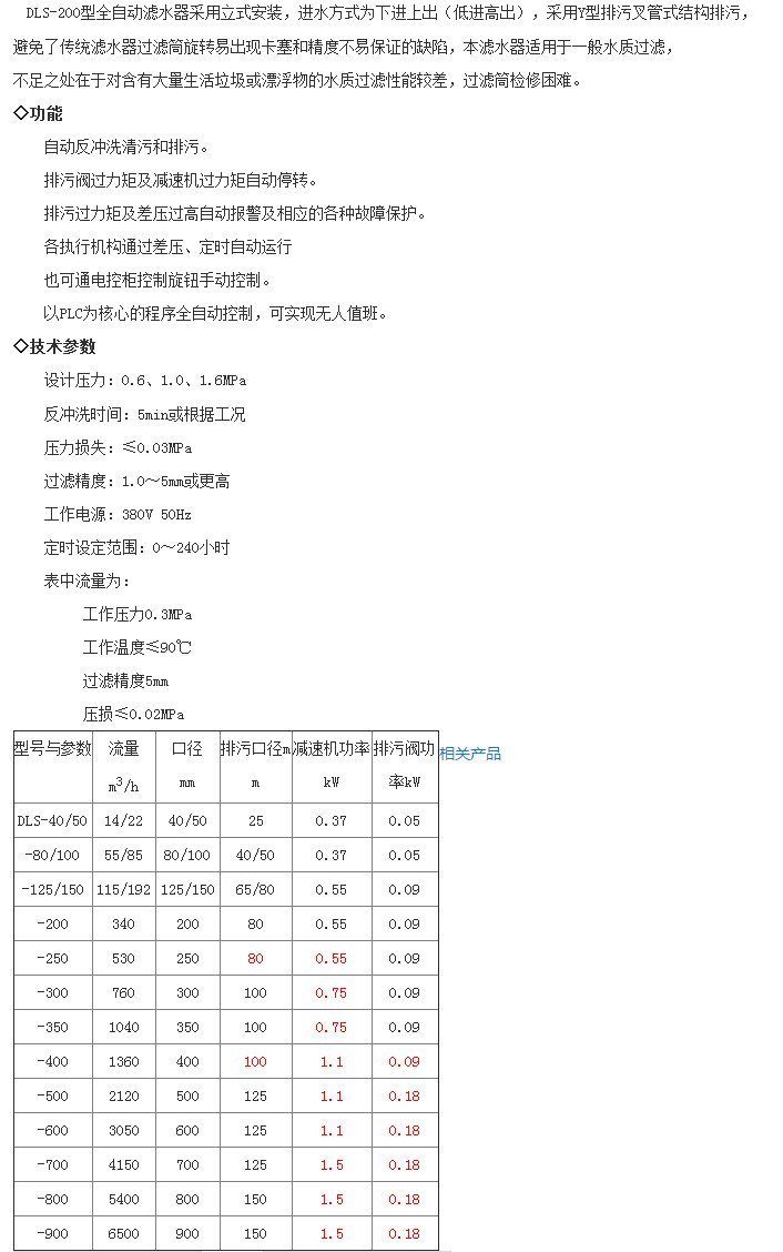 DLS-40/50,DLS-80/100,DLS-125/150,DLS-200,DLS-250,DLS-300,DLS-350,DLS-400,DLS-500,DLS-600,DLS-700,DLS-800,DLS-900,全自動濾水器
