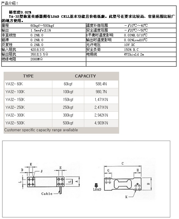 詳細(xì)信息 YA32-60K,YA32-100K,YA32-150K,YA32-250K,YA32-300K,YA32-500K,setech稱(chēng)重傳感器