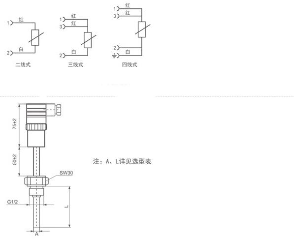 TP11包含一個(gè)PT100探頭,PT100阻值會(huì)隨溫度變化而變化,TP11有二線式,三線式,四線式幾種規(guī)格可供選擇。