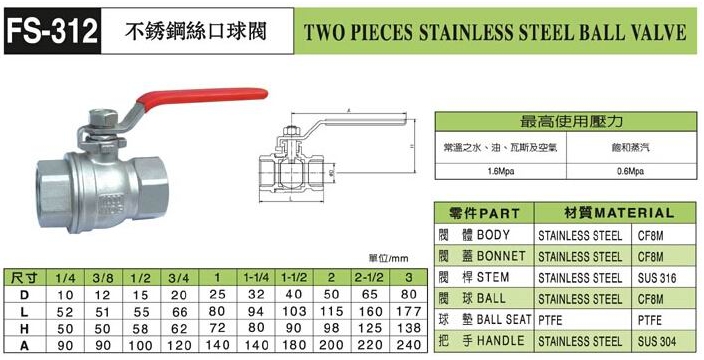 FS312不銹鋼絲口球閥,閥體、球芯全不銹鋼材質(zhì),PTFE密封,理想的環(huán)保產(chǎn)品,避免二次污染,再生利用價值大,不生銹、耐腐蝕。
