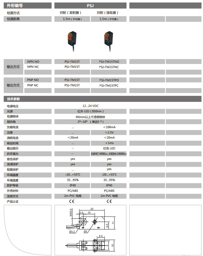 PSJ-TM15T,PSJ-TM15TNO,PSJ-TM15TNC,PSJ-TM15TPO,PSJ-TM15TPC,光電式傳感器