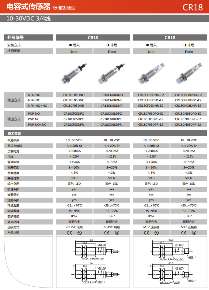 詳細信息 CR18CF05DNO,CR18CF05DNC,CR18CF05DNR,CR18CF05DPO,CR18CF05DPC,CR18CF05DPR,電容式傳感器
