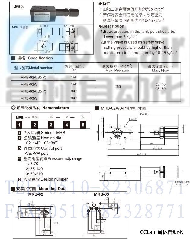 MRB-02A,MRB-02B,MRB-02P,MRB-02W,積層式溢流閥