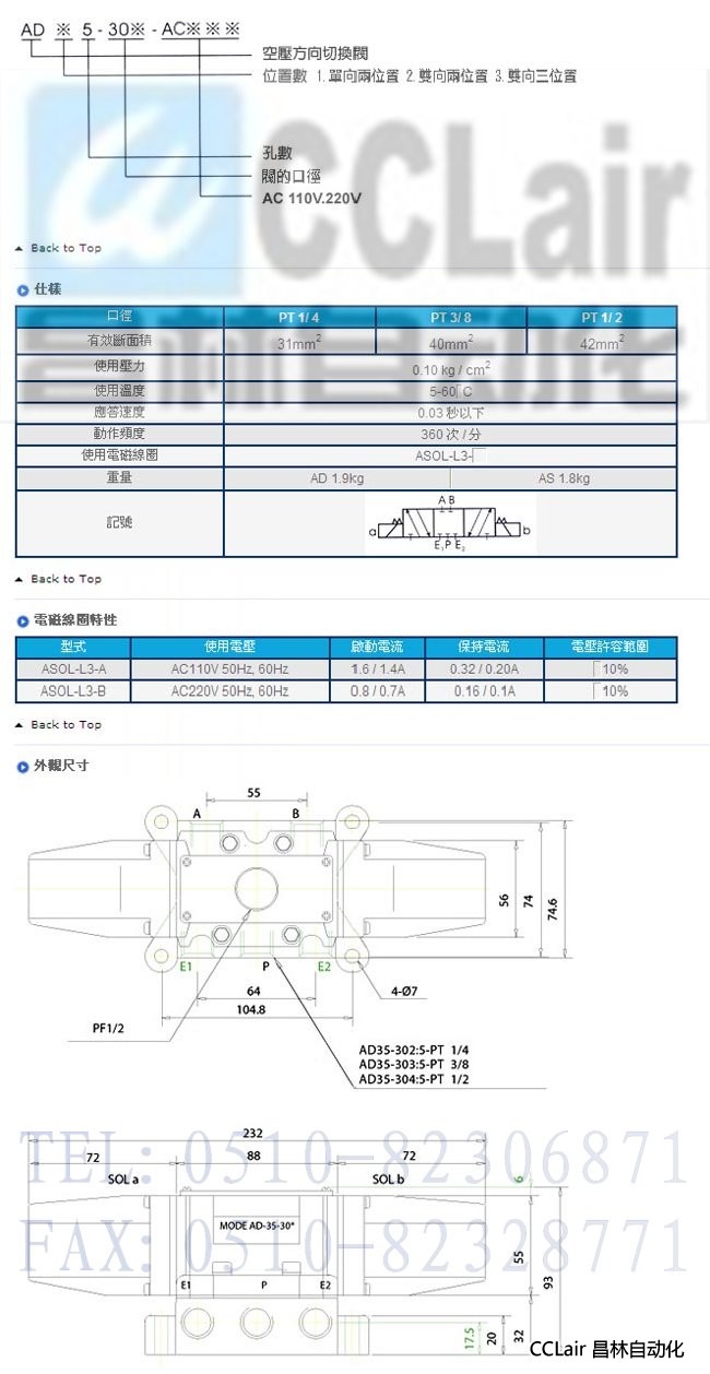 AD35-302, AS35-302,AD35-303, AS35-303,空壓用直動式電磁閥