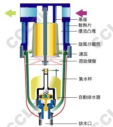 為使壓縮空氣有效去除水份及不阻塞濾蕊,以創(chuàng)新的設(shè)計結(jié)構(gòu),將擾流分離等物理原理多重應(yīng)用在濾蕊之前端,可去除大部份的水份與雜質(zhì),剩餘的水份再由過濾蕊子來濾除,如此配置將可有效去除水份與雜質(zhì),其濾蕊不易阻塞,可延長使用壽命,更不會產(chǎn)生壓降,使空壓系統(tǒng)操作順暢無後顧之憂。