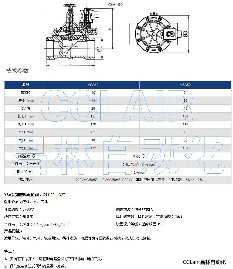 YSA40,YSA50,塑料電磁閥,G1〞~G2〞