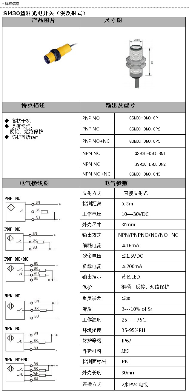 詳細(xì)信息 GSM30-DM0.8P1,GSM30-DM0.8P2,GSM30-DM0.8N1,GSM30-DM0.8N2,GSM30-DM0.8N3,SM30光電(漫反射)