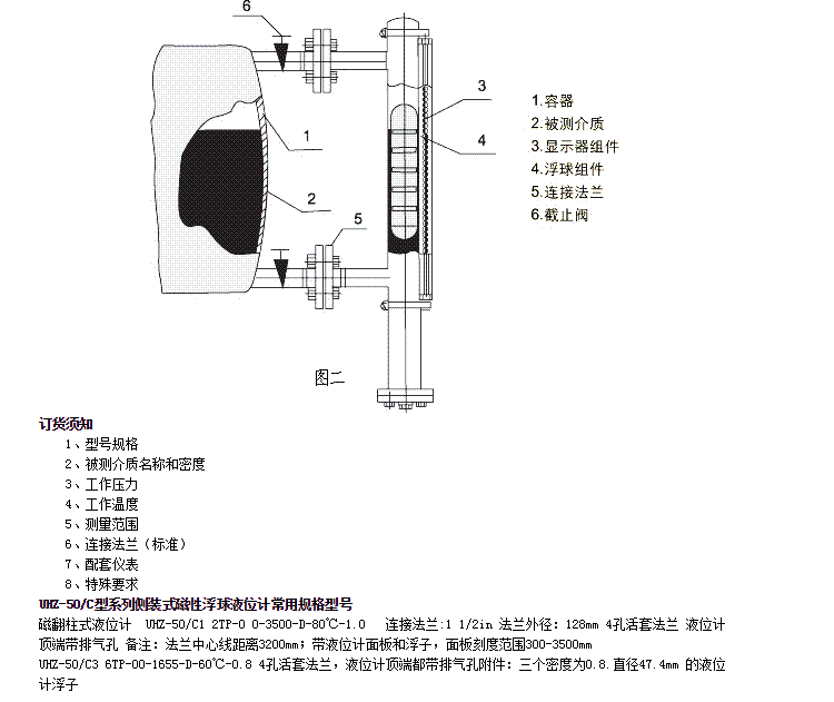 詳細(xì)信息 UHZ-50/C12TP-0O-3500-D-80℃-1.0UHZ-50/C1,UHZ-50/C2,UHZ-50/C3,側(cè)裝式磁性浮球液位計(jì)