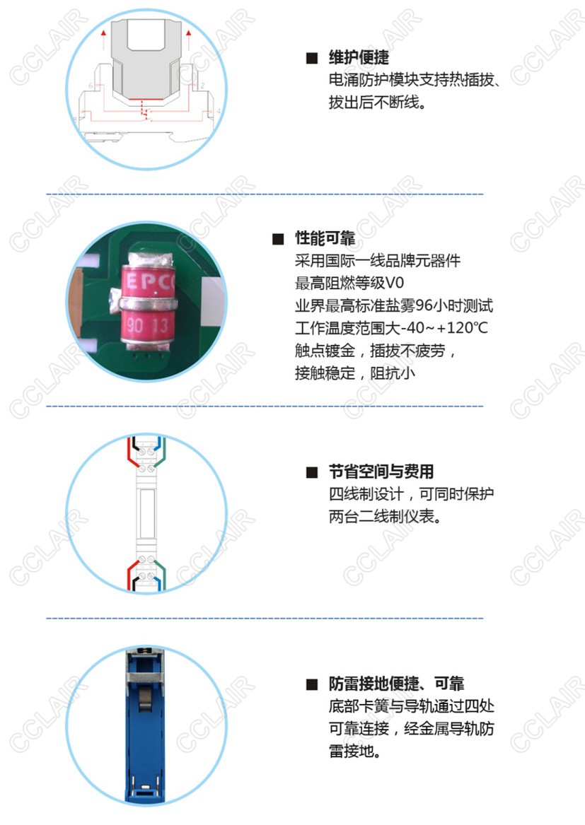 5V信號SPD,三線制、四線制,適用于線對地隔離電壓<500V信號回路,最大放電電流Imax(8/20us):20kA/線,12.5mm超薄,通過DIN35金屬導軌接地。