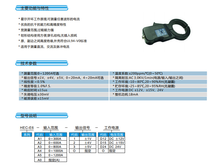 詳細(xì)信息 HEC-E6,HEC-E6-A1,HEC-E6-A2,HEC-E6-A3,HEC-E6-A4,HEC-E6-A5,HEC-E6-A0鉗形電流傳感器