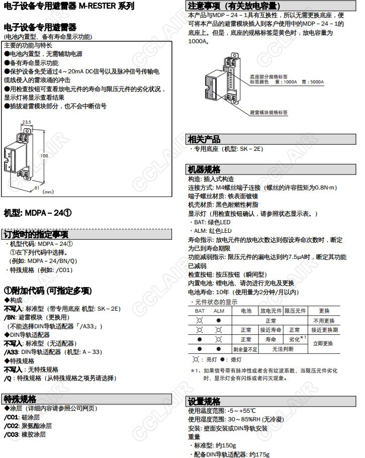 MDPA-24/MDPA-65,MDPA-24/BN/Q,,4-20mA直流、脈沖信號用 插入型 電池內(nèi)置型 壽命顯示功能避雷器