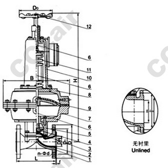 部件列表:1.閥體 2.閥體襯里 3.隔膜 4.閥瓣 5.下閥桿 6.閥蓋 7.氣缸 8.氣動薄膜 9.彈簧 10.氣缸蓋