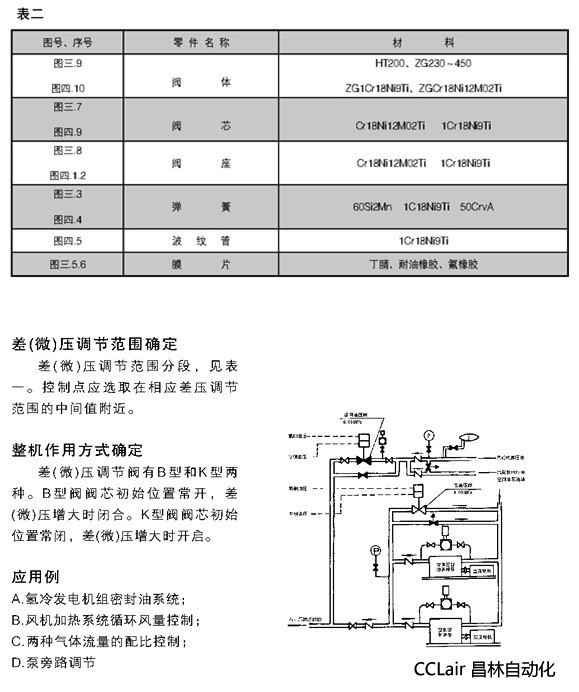 ZZC和ZZV自力式差(微)壓調(diào)節(jié)閥是一種不需要外加能源的執(zhí)行器產(chǎn)品.可用于公稱壓力PN01,PN10.差(微)壓均可分段調(diào)節(jié).從50mm .W.C至0.1MPa.其用途十分廣泛,可用于工業(yè)燃燒系統(tǒng),控制兩種物料,如煤氣,空氣流量配比,以達理想燃燒.用于氫冷發(fā)電機組密封油系封.當(dāng)差壓閥的低壓端通大氣即為微壓閥(差壓閥負壓,端壓,力為零).