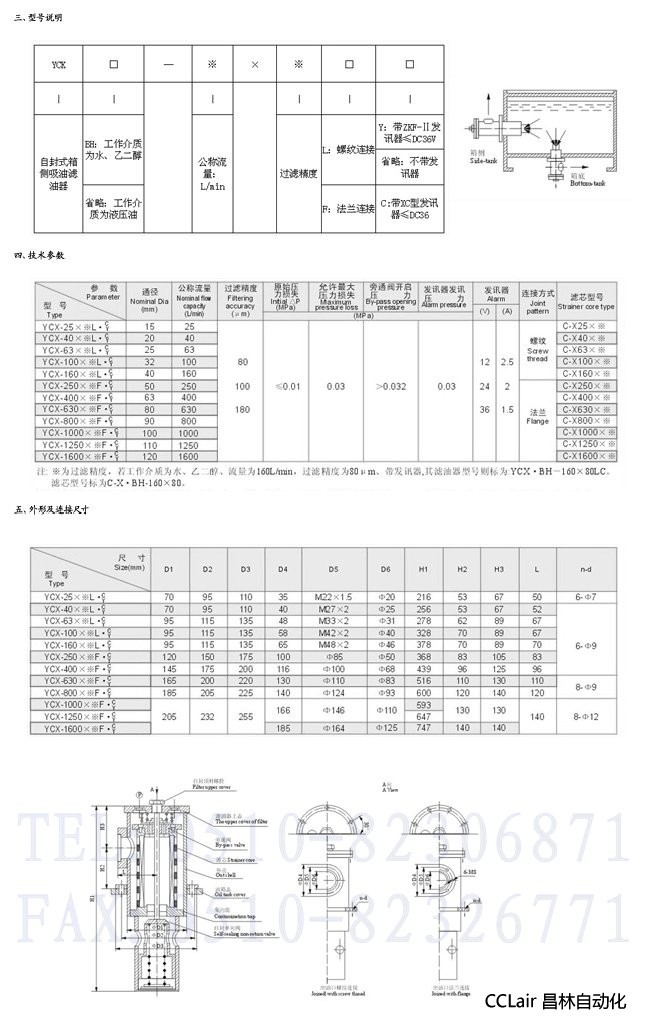 b、設(shè)有壓差發(fā)訊器裝置及旁通閥:當濾芯被污物堵塞,濾油器進出油口壓差增0.03Mpa時,壓差發(fā)訊裝置能自動開啟電源發(fā)訊。(發(fā)訊電源0-36伏范圍內(nèi)通用)。若此時不能停機即時處理,則旁通閥即自動開啟,另開油路避免液壓泵產(chǎn)生吸空損壞事故。