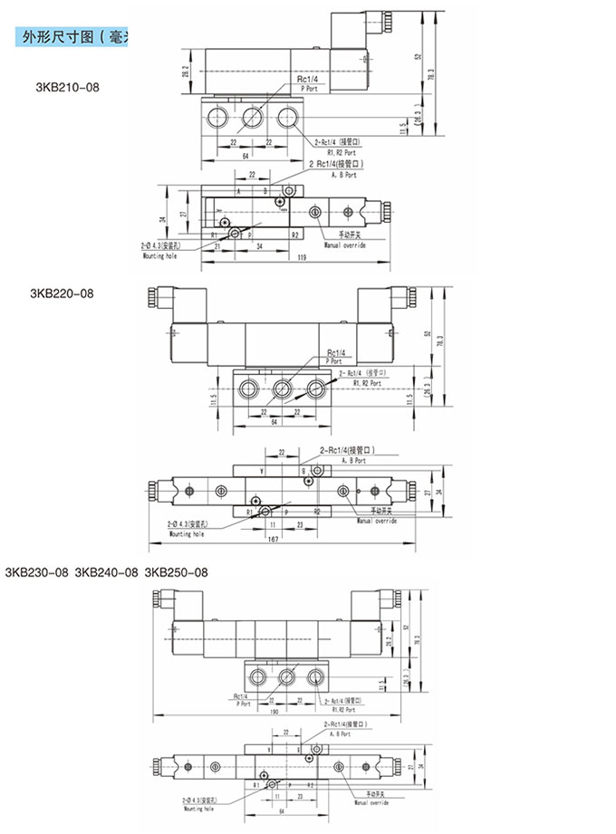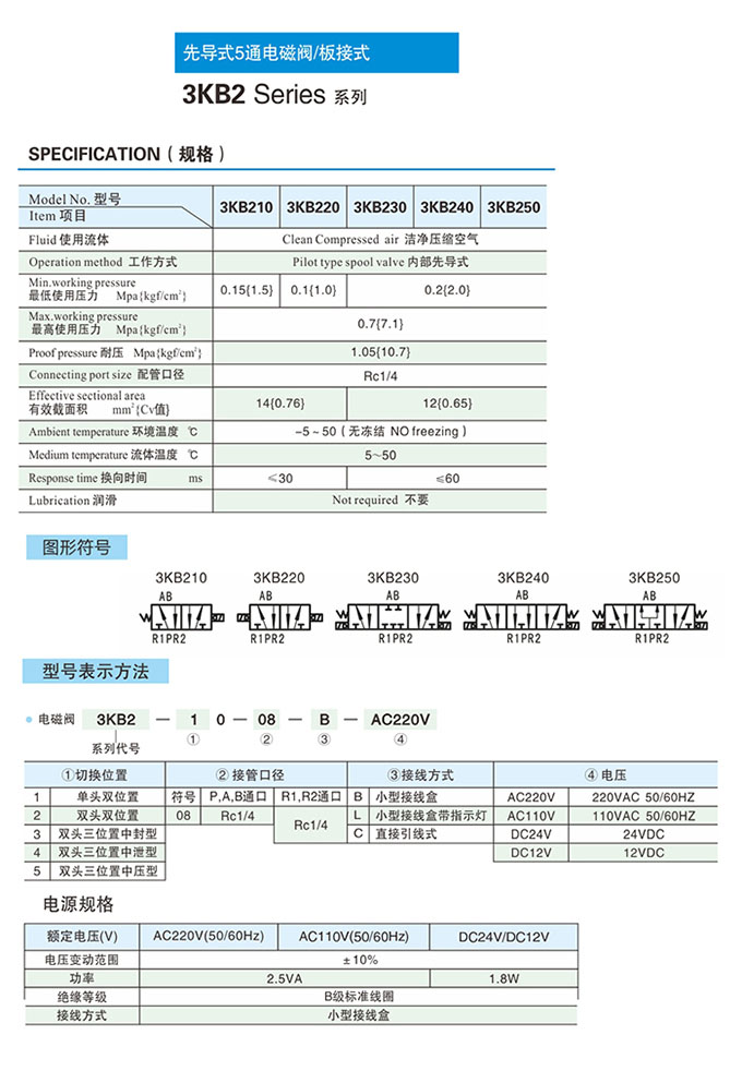 3KB210-08,3KB220-08,3KB230-08,3KB240-08,3KB250-08,3KB210-08-B,先導式五通電磁閥