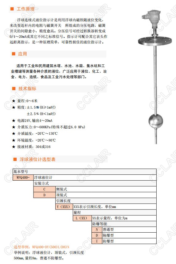 詳細(xì)信息 WFQ400-C,WFQ400-D,WFQ400-DY(500)L(08)N,浮球液位計(jì)