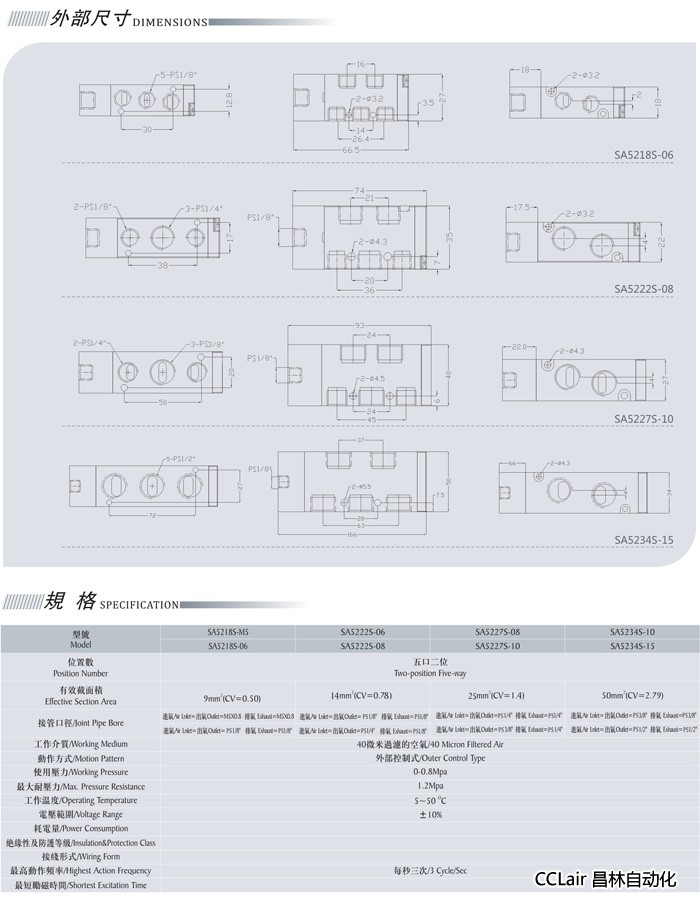 SA5222S-06,SA5218S-06,SA5227S-08,SA5234S-10,五口二位氣控閥