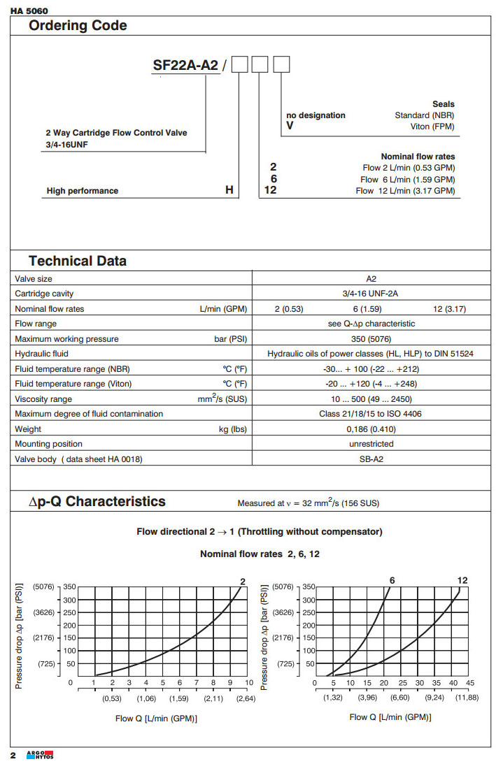 SF22A-A2/H2,SF22A-A2/H6,SF22A-A2/H12,ARGO 2路插裝流量控制閥