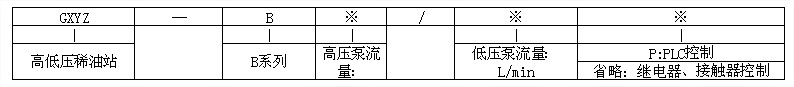 如采用B 系列,高壓流量為20L/min;高壓壓力為31.5MPa,低壓供油壓力為0.4MPa;而低壓供油量為100L/min的高(低)壓稀油站,采用繼電器、接觸器控制的則按如下方法標(biāo)注:GXYZ-B20/100
