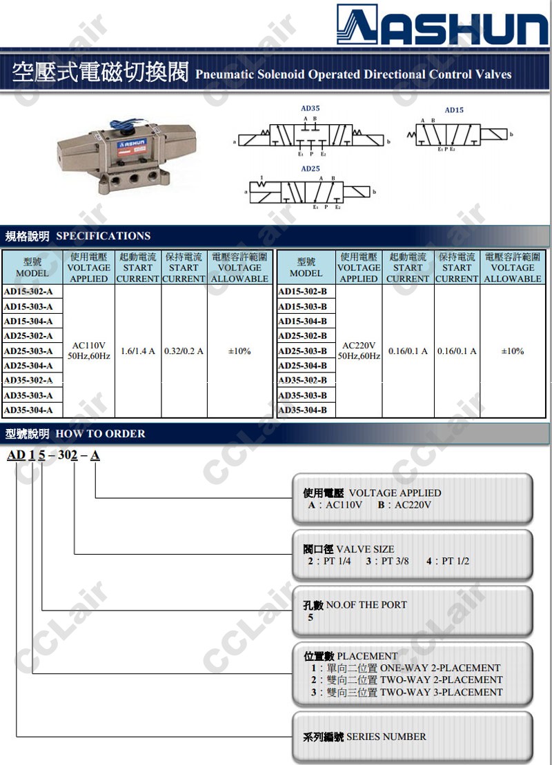 AD15,AD25,AD35,AD15-302-A,AD25-304-A,AD35-303-A,AD25-303-A,ASHUN油順空壓式電磁切換閥