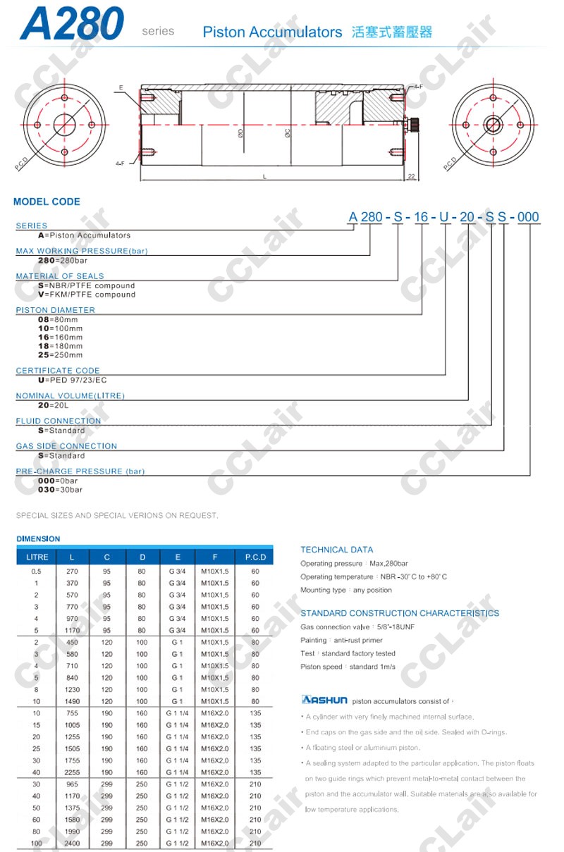 A280-S,A280-V,A280-S-08-U-20-SS-000,A280-V-10-U-20-SS-030,ASHUN油順活塞式蓄能器